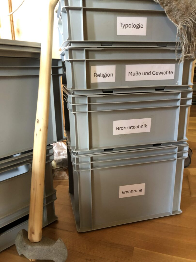 Was ist nun aber zu sehen im MobilenMuseum? Hier werden hauptsächlich Repliken und Rekonstruktionen gezeigt. Das hat den Hintergrund, dass sich mit Rekonstruktionen ein viel plastischeres Bild der Vergangenheit erzeugen lässt als mit Originalen. Ein Steinbeil zum Beispiel wird besser verstanden, wenn es als Rekonstruktion mit Holzschaft und Wicklung angefasst werden kann, als wenn es ohne diese Elemente in einer Vitrine liegt.
