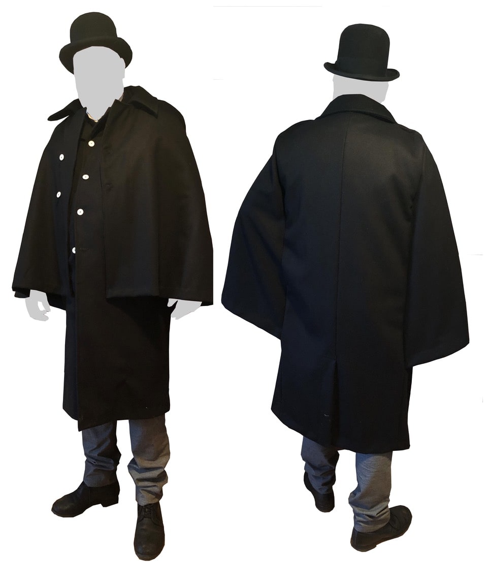 Ein spezieller Mantel aus den 1880er Jahren, der bis heute eine kleine Liebhabergemeinde hat, ist der Havelock oder auch Inverness. Dieses Stück ist aus schwarzem Wolltuch mit einem Köperfutter, die Knöpfe sind aus Bein. Eine spannende Herausforderung waren die Schultern.